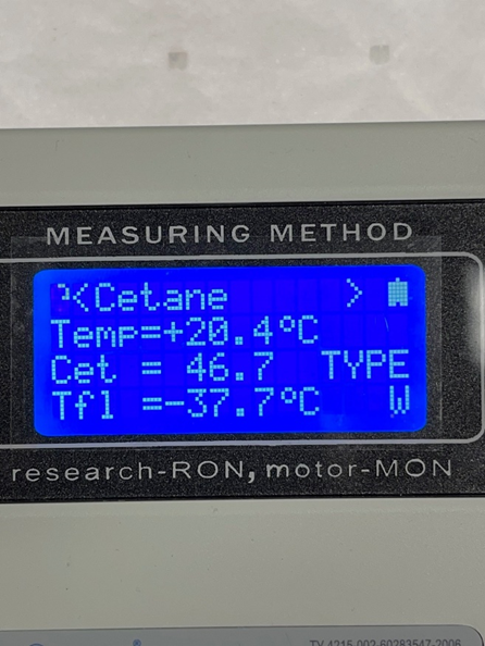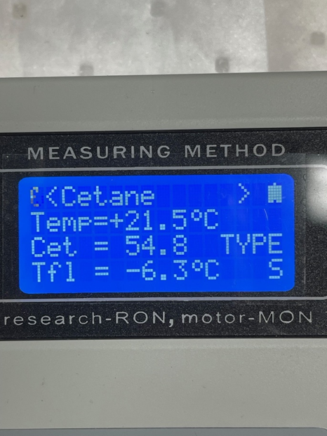 CFCS has 3 different makes of Cetane/octane testing equipment and we tested all 3 as a test with the Cetane 54cn Certified Reference material, two read identical at 54cn and one read 52cn (allowable maximum error of the equipment) before imputing the calibration menu.
